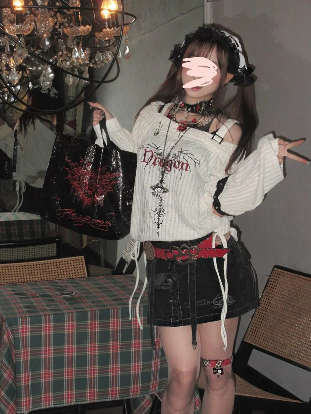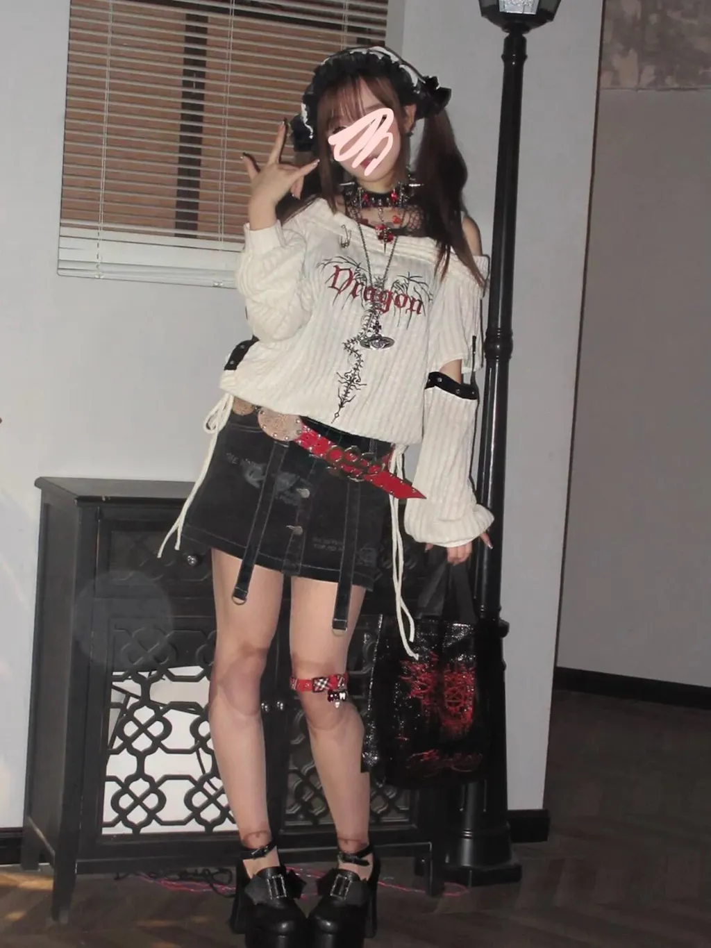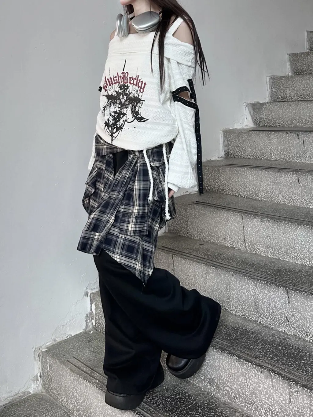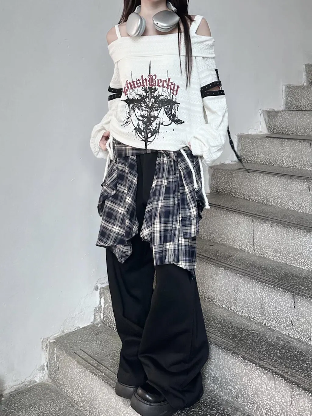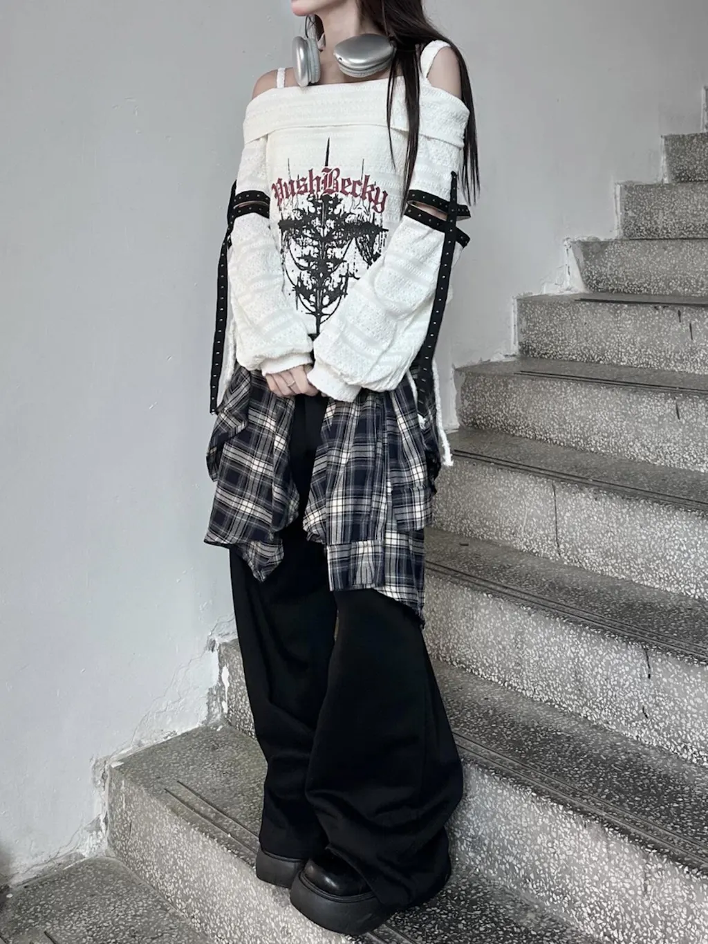 - こちらの「ダークで個性的なアンダーグラウンドスタイルのパンク刺繍スタッズ長袖オフショルダーニットトップス」は、独自の魅力を持つアイテムです。
