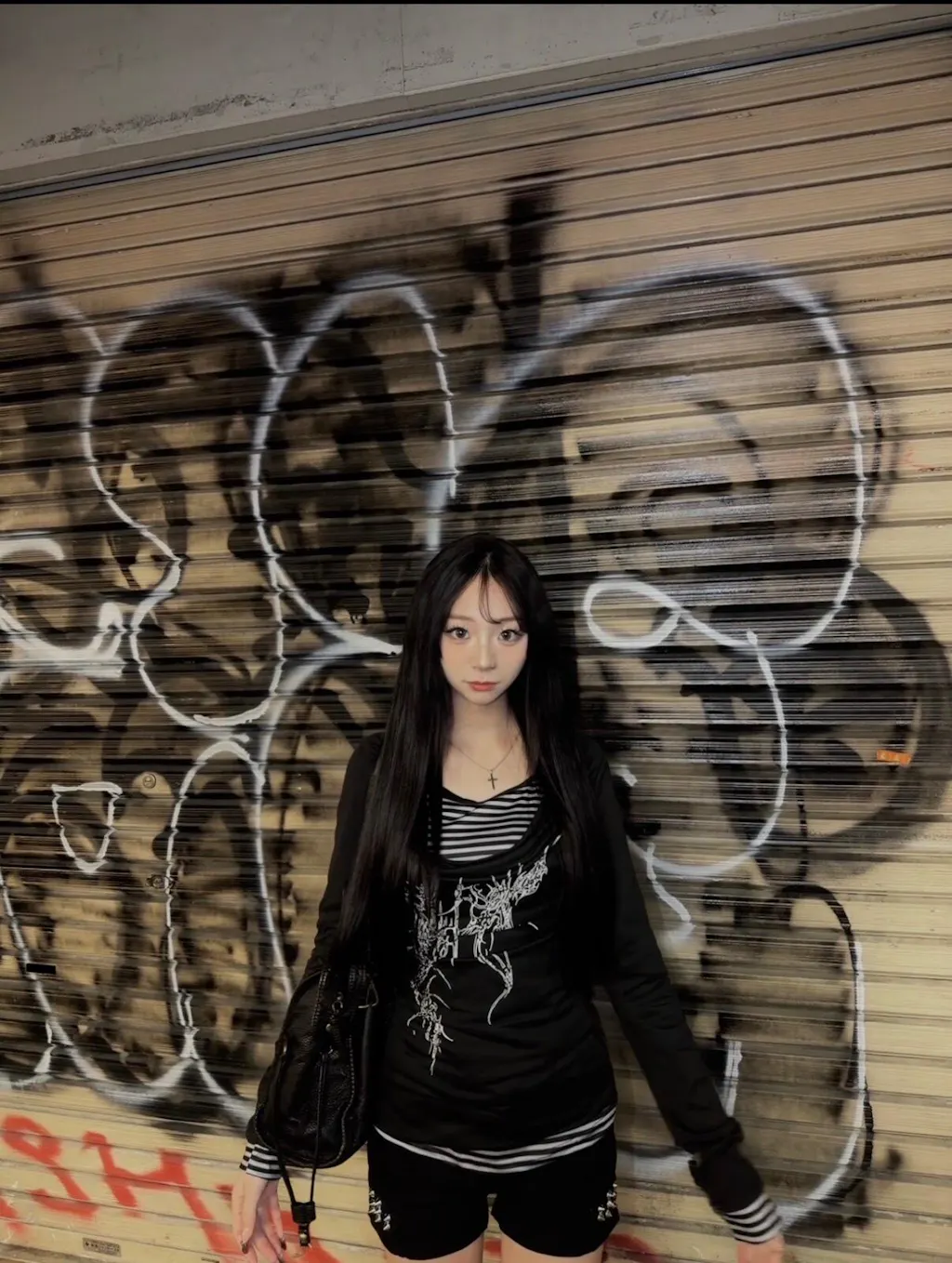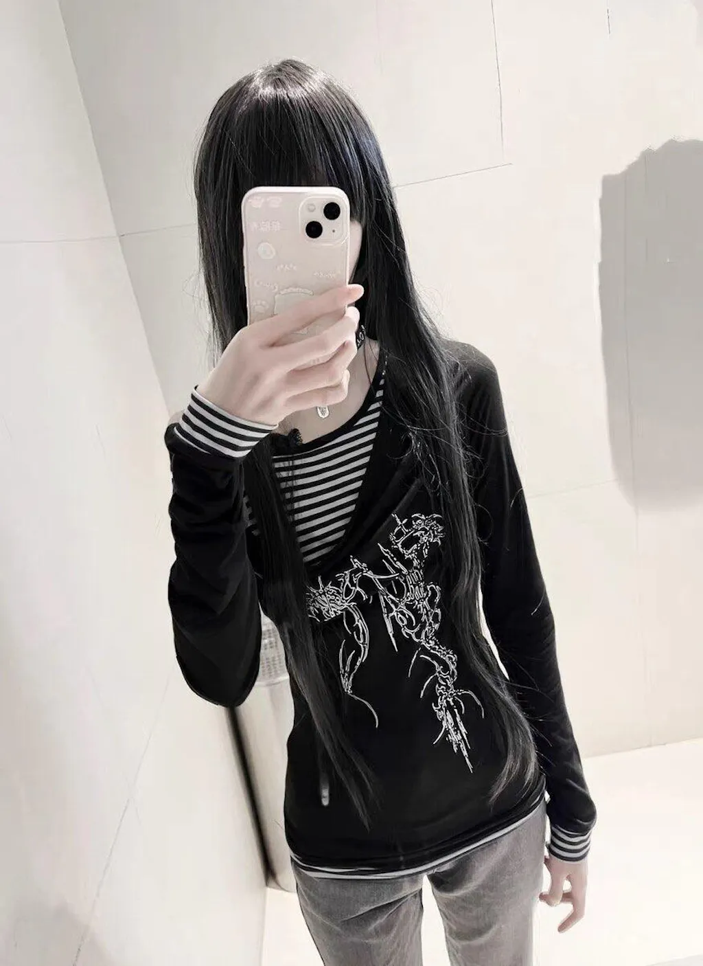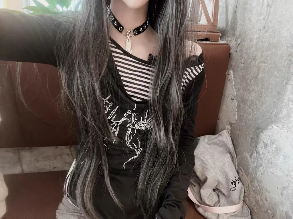 個性満点!大胆なデザインが特徴のこの長袖Tシャツは、パンク×Y2K×アンダーグラウンドな魅力をたっぷり詰め込んだ一枚。斜めにカットされた肩ラインデザインで、エッジの効いたコーデが完成。